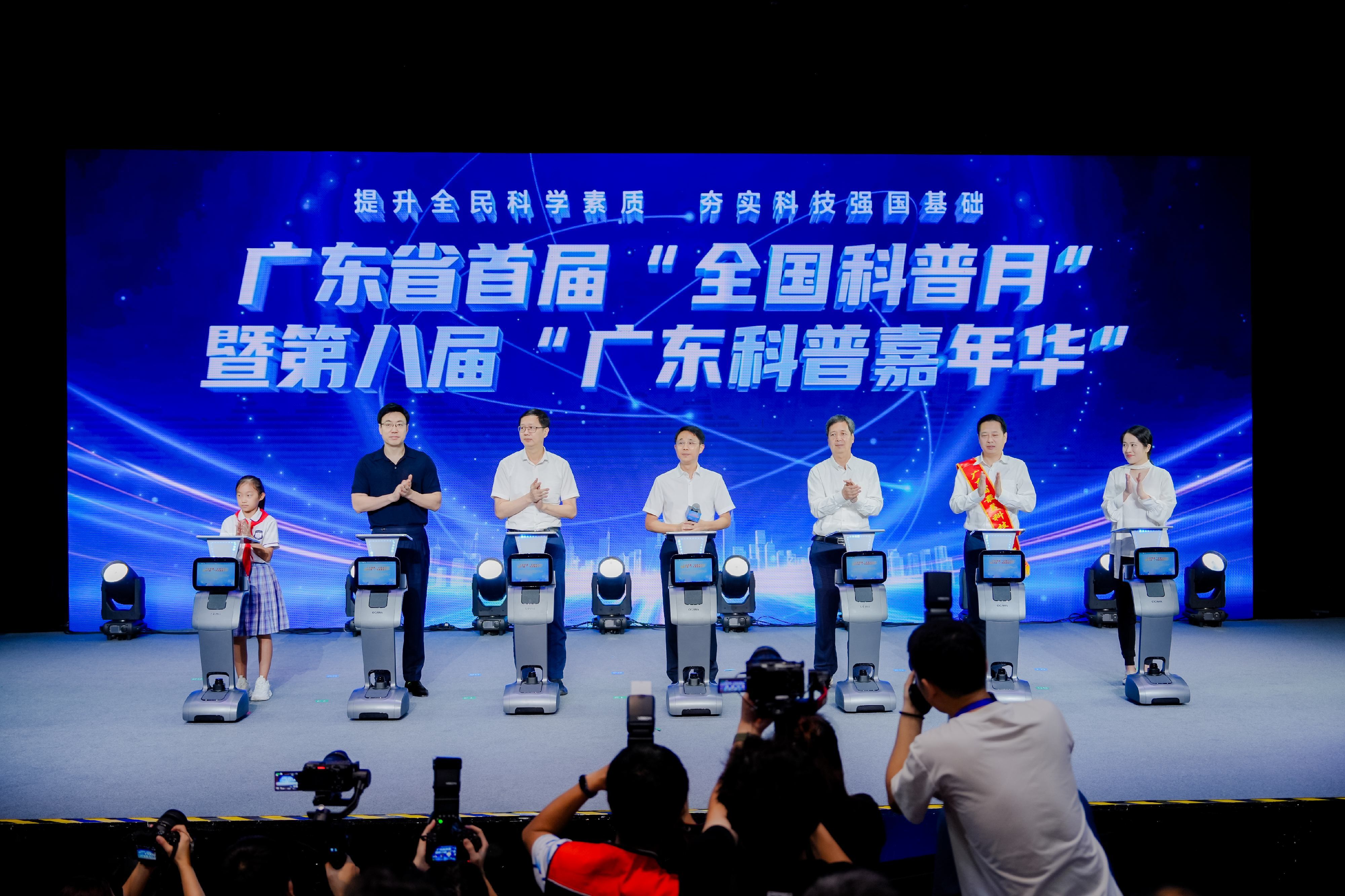 最后,主办单位领导嘉宾及科技工作者、科普工作者、科普企业代表共同在机器人智慧屏前按下启动键,见证广东省首个“全国科普月”系列活动全面拉开帷幕。