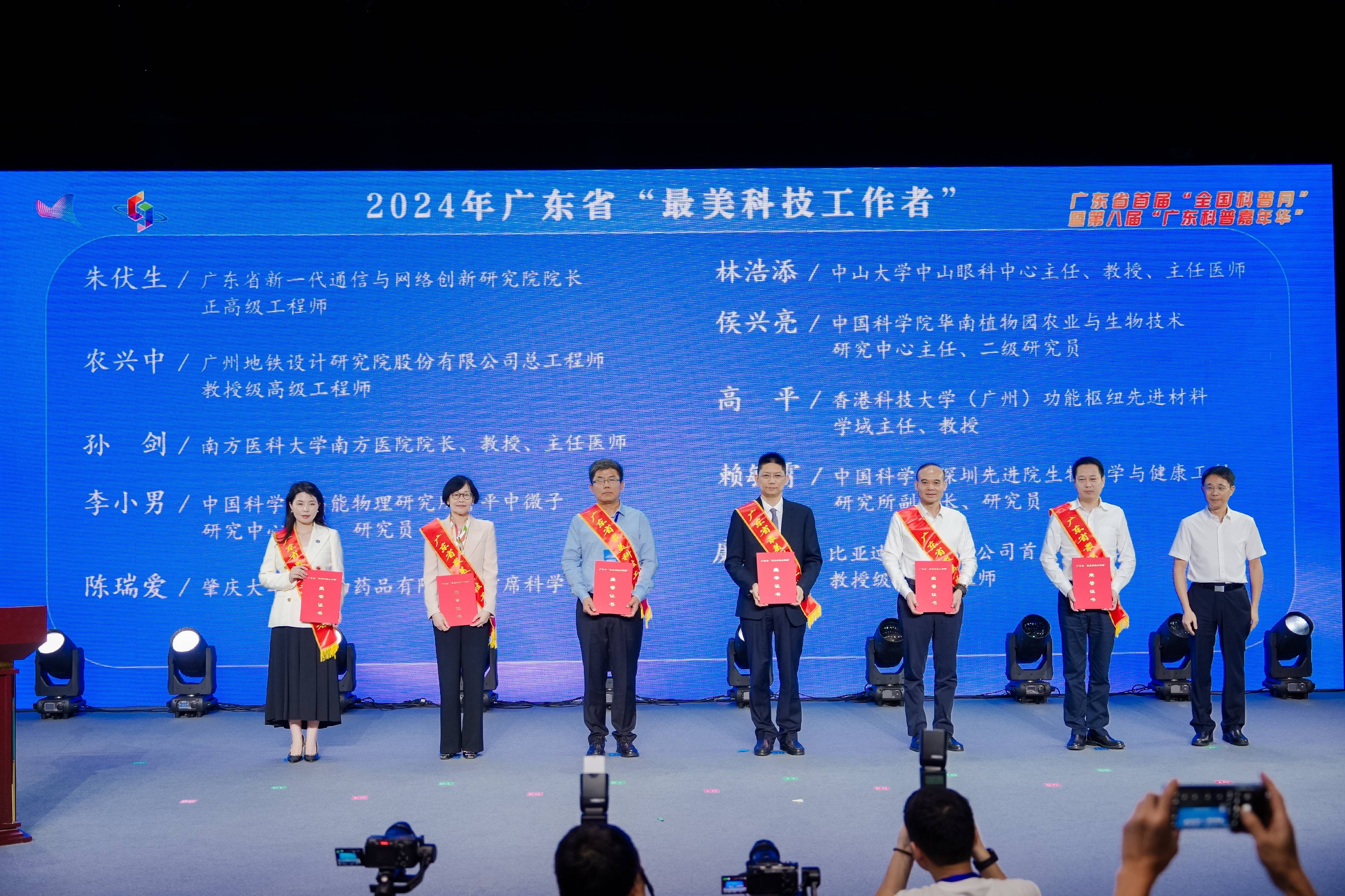 为弘扬科学家精神、树立科技榜样,成洪波向广东省新一代通信与网络创新研究院院长朱伏生、广州地铁设计研究院总工程师农兴中、南方医科大学南方医院院长孙剑、中国科学院高能物理研究所开平中微子研究中心主任李小男、香港科技大学(广州)功能枢纽先进材料学域主任高平、中国科学院深圳先进技术研究院生物医学与健康工程研究所副所长赖毓霄等2024年广东省“最美科技工作者”代表颁发荣誉证书。该评选由省科协、省委宣传部、省科技厅等多单位联合开展,经层层筛选,最终选出10名2024年广东省“最美科技工作者”。