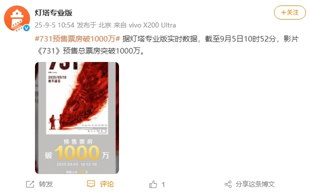 据数据显示,电影《731》目前的“猫眼想看数”已经突破430万,暂列近期“猫眼想看榜”第一。
